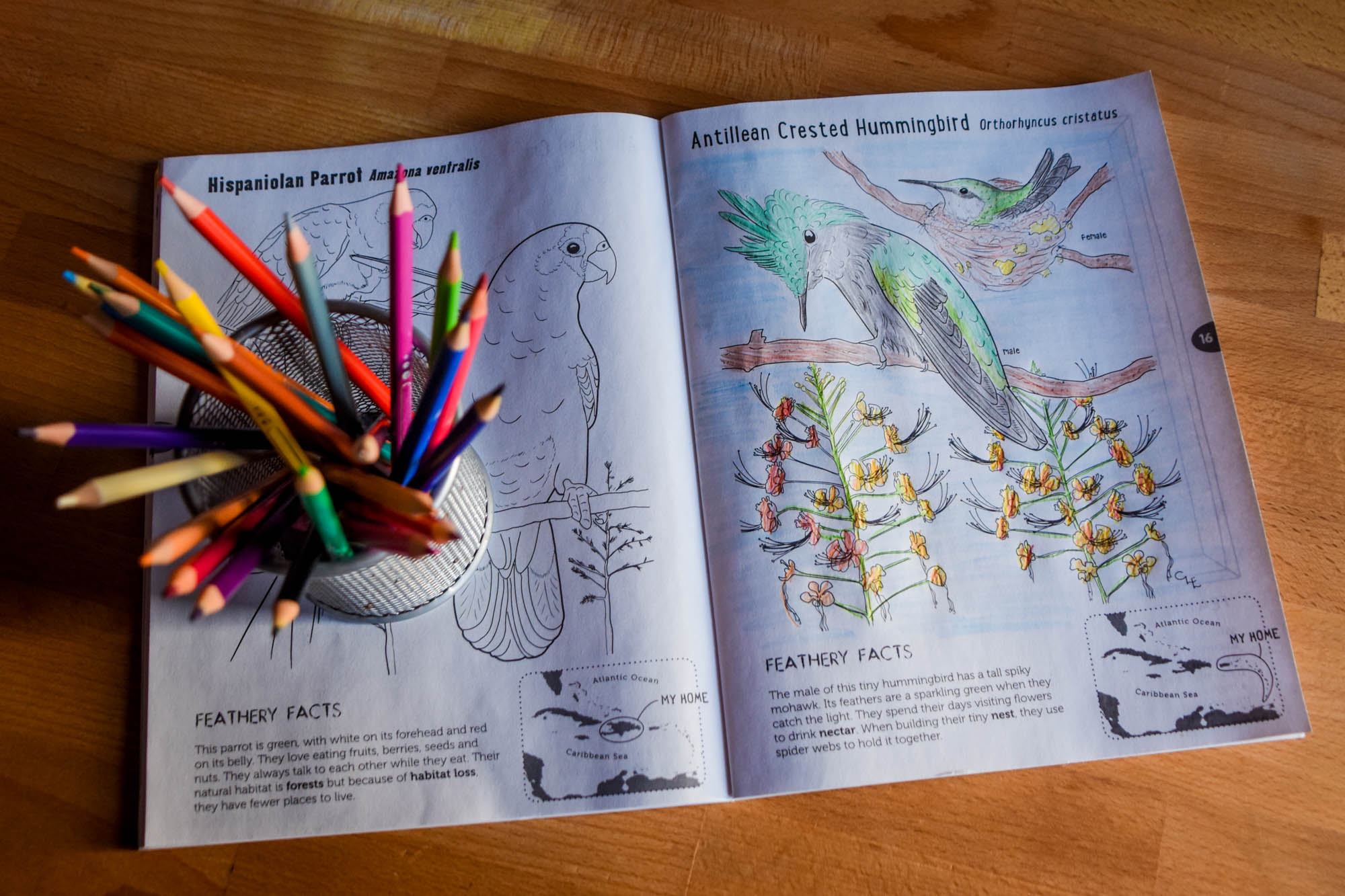 The coloring book features beautiful illustrations by artist Christine Elder, and text by Mark Yokoyama. It was published by BirdsCaribbean. There are 50 coloring pages and fun activities. The book also explains why there are so many unique birds here, and how we can help them.